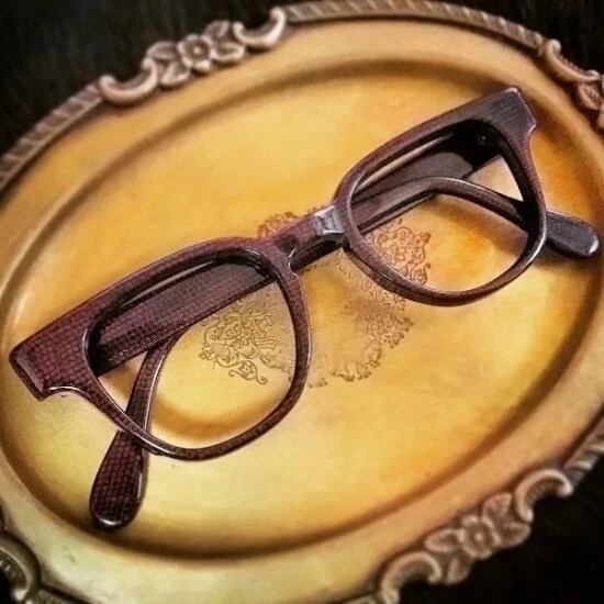 ヘビの表皮を思わせるコードヴァン生地にラメが入ったバーガンディーカラーのフレーム。